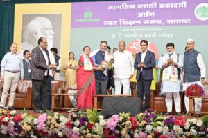 प्रतिनिधी नाशिक:- जागतिक मराठी अकादमी व रयत शिक्षण संस्थेच्या संयुक्त विद्यमाने छत्रपती शिवाजी महाविद्यालायत आयोजित करण्यात आलेल्या जागतिक मराठी संमेलनात भारत विकास गृपचे (बीव्हीजी) चेअरमन हणमंतराव गायकवाड यांना माजी कृषी मंत्री शरद पवार यांच्या हस्ते जागतिक मराठी भुषण पुरस्कार प्रदान करण्यात आला. या वेळी संमेलनाचे अद्यक्ष डॉ. आ. ह. साळुंखे, जागतिक मराठी अकादमीचे अद्यक्ष रामदास फुटाणे, स्वागताध्यक्ष चंद्रकांत दळवी, सांस्कृतीक कार्यमंत्री अशिष शेलार, उद्योग मंत्री उदय सामंत, पत्रकार राजीव खांडेकर, विकास देशमुख अभिनेते सयाजी शिंदे उपस्थित होते.