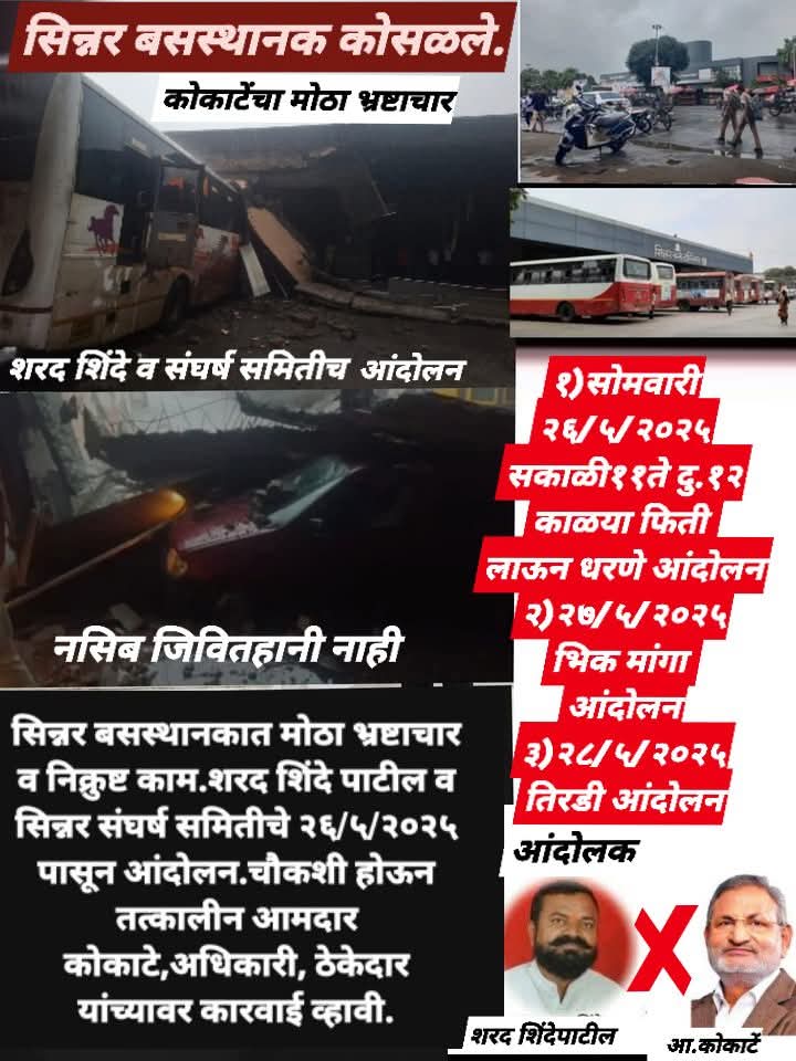 आपणास आंदोलक शरद शिंदे पाटील व सिन्नर संघर्ष समिती विनंतीपुर्वक कळवितो की सिन्नर येथील बसस्थानक अलिशान इमारत कामात प्रचंड भ्रष्टाचार झालेला आहेत. अगदी निक्रुष्ट दर्जाचे काम झालेले आहेत. आम्ही मागेही मागणी केलेली.आहेत. आज पावसात सदर आलिशान कमकुवत इमारत कोसळली.सुदैवाने जिवीतहानी झाली नाही. परंतु दररोज सदर ठिकाणी हजारो प्रवासी बसने प्रवास करण्यासाठी वर्दळ असते.यामध्ये वयोवृद्ध महिला पुरुष,विदयार्थी विदयार्थीनी,महिला, पुरुष ये जा करतात.तसेच बसस्थानकात असलेल्या होटल, केंटीन,पेपर स्टॉल,सायबर कजफे,क्लास व बेंकेत येत असतात.परंतु आज हे बसस्थानक कोसळले.जर तेथील प्रवासी सावध होत बाजुला पळाले नसते तर शेकडो जणांचे जीव गेले असते,शेकडो जखमी झाले असते.परंतु सिन्नर तालुक्यातील जनतेच दैव बलवतर म्हणून जिवितहानी पासून परमेश्वराने वाचवले.