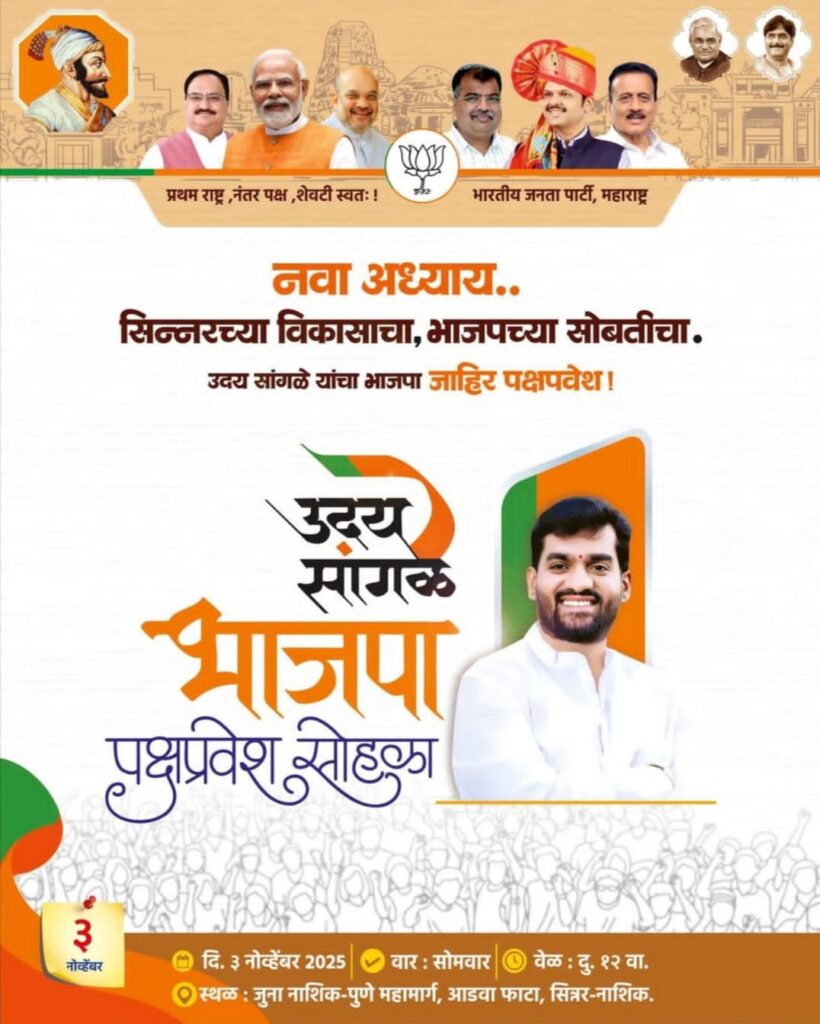 सिन्नर: आगामी होऊ घातलेल्या स्थानिक स्वराज्य संस्थांच्या पंचवार्षिक निवडणूक च्या पार्श्वभूमीवर सिन्नरमध्ये राजकीय हालचालींना वेग आला असून ठाकरे गटाची व खासदार वाजे भाऊ वाजे समर्थक भारत कोकाटे यांनी नुकताच ठाकरे गटातून बाहेर पडून भाजपमध्ये प्रवेश केला असतानाच महाविकास आघाडीला पुन्हा दुसरा धक्का बसला असून शरद पवार गटाचे नेते उदय सांगळे यांनी ही शरद पवार गटाची देऊन भाजपमध्ये प्रवेश करण्याचे निश्चित झाले आहे व या पक्षप्रवेशाचा कार्यक्रम तीन नोव्हेंबर रोजी होणार असल्याचे घोषित करण्यात आले आहे.
