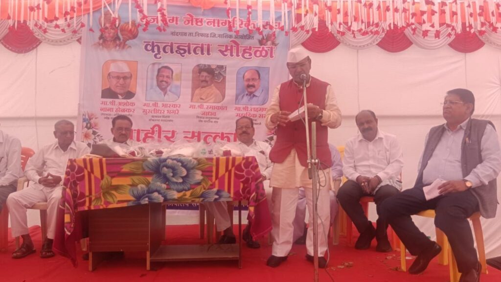 निफाड:निफाड तालुक्यातील नांदगाव येथे जय बजरंग जेष्ठ नागरिक संघाची मोठ्या उत्साहात स्थापना करण्यात आली .या कार्यक्रमाच्या अध्यक्ष स्थानी नाशिक जिल्हा जेष्ठ नागरिक संघाचे अध्यक्ष व आखिल भारतीय जेष्ठ नागरिक संघाचे उपाध्यक्ष मा.अशोक नाना होळकर हे होते.या कार्यक्रमास खासदार मा.भास्कर मुरलीधर भगरे सर यांची उपस्थिती लाभली. याप्रसंगी भारतनगर नाशिक जेष्ठ नागरिक संघाचे अध्यक्ष मा.उत्तमराव कडलग, फेसकाॅम नाशिक चे सचिव मा.धनंजय चतूर,निफाड तालूका जेष्ठ नागरिक संघाचे अध्यक्ष मा.रमाकांत जाधव यांनी मनोगत व्यक्त करून जेष्ठ नागरिक संघाचे ध्येय, उद्दिष्टे,व फायदे विशद केले.या प्रसंगी महाराष्ट्राचे जेष्ठ सुप्रसिद्ध कवी प्रा.लक्ष्मण महाडिक यांनी हा नुसताच जेष्ठ नागरिकांना फायदा व्हावा यासाठी स्थापन झालेला नसून, जेष्ठ नागरिकांच्या फायदया बरोबरच गावातील तरूणांना मार्गदर्शनाच्या भूमिकेत असला पाहिजे मग ते मार्गदर्शन गावाच्या विकासासाठी धार्मिक, शैक्षणिक, सहकार व राजकीय असले पाहिजे.त्याच बरोबर गावातील मंदिराबरोबरच गावातील शाळेला ज्ञानमंदिर समजून त्या सरस्वतीच्या मंदिराकडे लक्ष दिले पाहिजे.