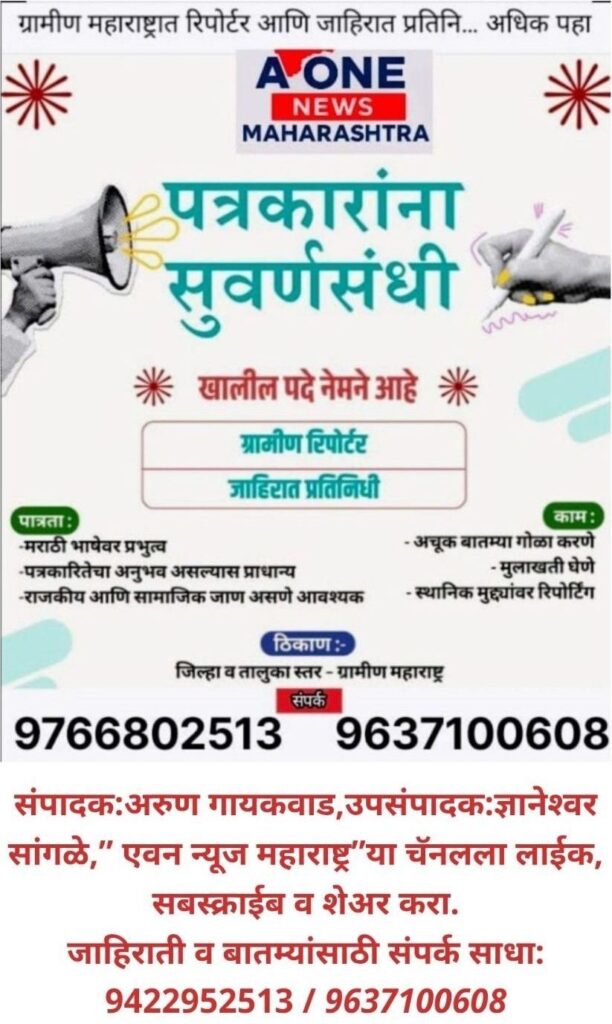 जनतेच्या न्याय हक्का साठी Aone News Maharashtra aonenewsmaharashtra.in आपले स्वागत आहे! आम्ही एक अग्रगण्य आणि विश्वासार्ह बातम्या प्रकाशक आहोत, जे तुम्हाला ताज्या बातम्या, क्रीडा, विज्ञान, तंत्रज्ञान, मनोरंजन, आरोग्य आणि इतर महत्त्वाच्या घटनांबद्दल अपडेट्स पुरवत आहेत. तुम्हाला अचूक आणि विश्वासार्ह बातम्या देण्याचा आमचा उद्देश आहे, जेणेकरून तुम्ही जगात काय चालले आहे ते जाणून घेऊ शकता.आमच्या कार्यसंघामध्ये अनुभवी पत्रकार, लेखक आणि वृत्त व्यावसायिकांचा समावेश आहे ज्यांना त्यांच्या क्षेत्रातील कौशल्य आहे आणि ते तुम्हाला सर्वोत्तम बातम्या सेवा देण्यासाठी वचनबद्ध आहेत. आम्ही सचोटीने, न्यायाने आणि स्वातंत्र्याने बातम्या प्रकाशित करतो, जेणेकरून तुम्हाला आमच्याद्वारे खरी आणि निर्णायक माहिती मिळू शकेल. बातम्या आणि माहितीच्या माध्यमातून समाजाला शिक्षित करणे, समृद्धी आणि प्रगतीकडे मार्गदर्शन करणे हे आमचे ध्येय आहे.आम्ही तुम्हाला नेहमीच पाठिंबा देण्यासाठी येथे आहोत आणि आम्ही तुमच्या सूचना आणि अभिप्रायाचे स्वागत करतो.आम्ही तुम्हाला बातम्यांच्या जगात अद्ययावत राहण्यात मदत करूतो, आमच्या वेबसाइटला भेट दिल्याबद्दल धन्यवाद.......