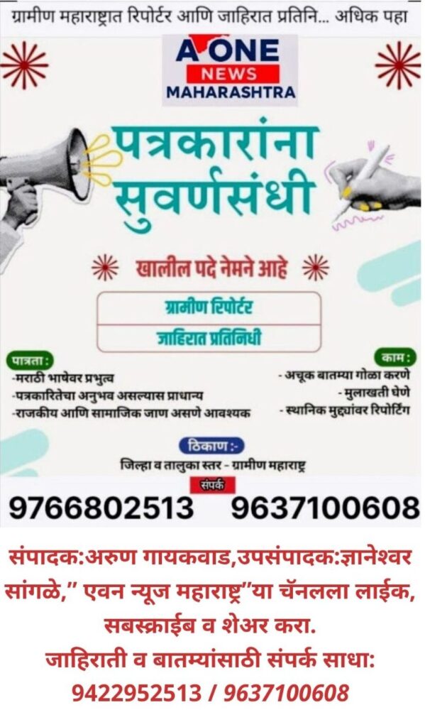 जनतेच्या न्याय हक्का साठी Aone News Maharashtra aonenewsmaharashtra.in आपले स्वागत आहे! आम्ही एक अग्रगण्य आणि विश्वासार्ह बातम्या प्रकाशक आहोत, जे तुम्हाला ताज्या बातम्या, क्रीडा, विज्ञान, तंत्रज्ञान, मनोरंजन, आरोग्य आणि इतर महत्त्वाच्या घटनांबद्दल अपडेट्स पुरवत आहेत. तुम्हाला अचूक आणि विश्वासार्ह बातम्या देण्याचा आमचा उद्देश आहे, जेणेकरून तुम्ही जगात काय चालले आहे ते जाणून घेऊ शकता.आमच्या कार्यसंघामध्ये अनुभवी पत्रकार, लेखक आणि वृत्त व्यावसायिकांचा समावेश आहे ज्यांना त्यांच्या क्षेत्रातील कौशल्य आहे आणि ते तुम्हाला सर्वोत्तम बातम्या सेवा देण्यासाठी वचनबद्ध आहेत. आम्ही सचोटीने, न्यायाने आणि स्वातंत्र्याने बातम्या प्रकाशित करतो, जेणेकरून तुम्हाला आमच्याद्वारे खरी आणि निर्णायक माहिती मिळू शकेल. बातम्या आणि माहितीच्या माध्यमातून समाजाला शिक्षित करणे, समृद्धी आणि प्रगतीकडे मार्गदर्शन करणे हे आमचे ध्येय आहे.आम्ही तुम्हाला नेहमीच पाठिंबा देण्यासाठी येथे आहोत आणि आम्ही तुमच्या सूचना आणि अभिप्रायाचे स्वागत करतो.आम्ही तुम्हाला बातम्यांच्या जगात अद्ययावत राहण्यात मदत करूतो, आमच्या वेबसाइटला भेट दिल्याबद्दल धन्यवाद.......