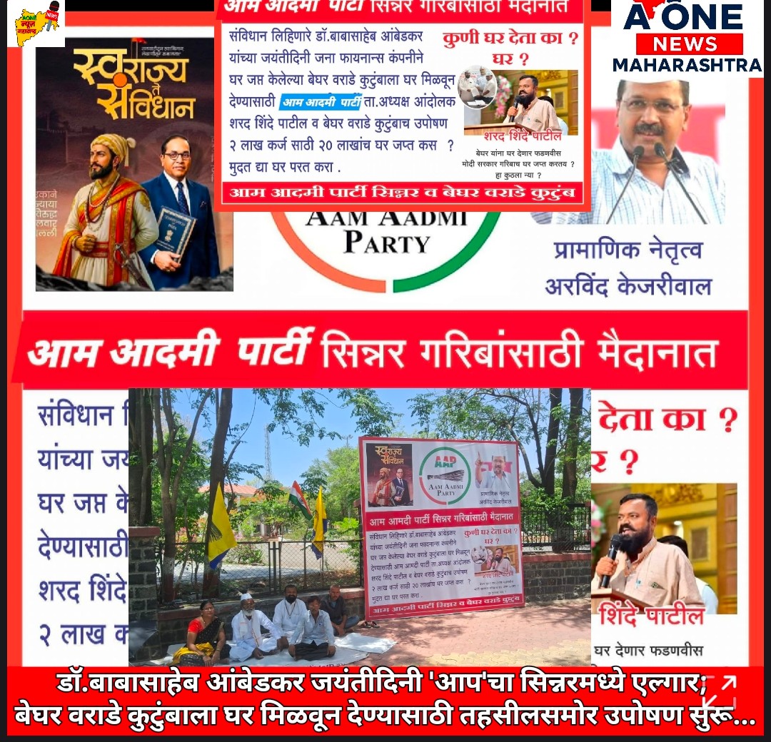 प्रतिनिधी: भाऊसाहेब हांडोरे,सिन्नर एकीकडे संपूर्ण देश भारतीय संविधानाचे शिल्पकार डॉ. बाबासाहेब आंबेडकर यांची जयंती साजरी करत असतानाच, दुसरीकडे सिन्नरमध्ये एका गरिबाचे हक्काचे घर वाचवण्यासाठी ‘आम आदमी पार्टी’ने आक्रमक पवित्रा घेतला आहे. अवघ्या २ लाखांच्या कर्जापोटी २० लाखांचे घर जप्त झाल्याने गेल्या दीड वर्षांपासून रस्त्यावर आलेल्या वराडे कुटुंबाला न्याय मिळावा, यासाठी